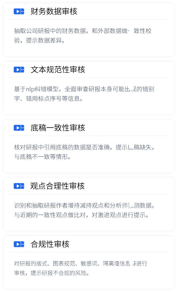 智能研报审核系统是凯发k8国际数据为券商研究所、买方研究组织等用户打造的集研报解析、抽取、审核、管理功能为一体的产品。集成OCR、NLP、机器学习等技术,对研报和底稿信息进行多方面抽取,并对研报进行数据、文本、观点等全方位的自动化审核, 同时对研报和底稿进行规范化、流程化管理,帮助用户提升工作效率,把控研报发布的时效性和合规性,全面降低出错风险。